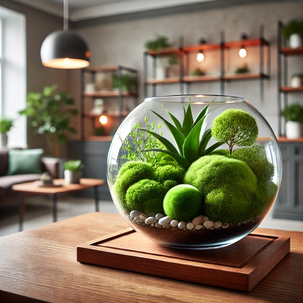 苔テラリウムは、ガラス容器の中に苔や小さな植物を配置したミニチュアの庭園です。苔は湿度管理が比較的簡単で、日陰でも育つため、室内での管理が容易です。インテリアとしても優れており、デスクやリビング、玄関などに置くことで、空間に自然のアクセントを加えることができます。